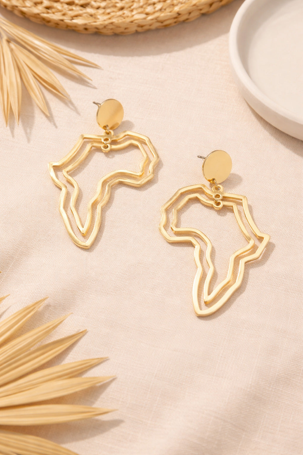 Elevate your style with the AfriGold Duet earrings, exquisitely crafted in a refined gold finish shaped like the African continent. These elegant drop earrings blend cultural significance with timeless sophistication, making them a perfect accessory for any occasion. Their graceful design adds a subtle yet striking statement to your ensemble, celebrating heritage with a modern touch.