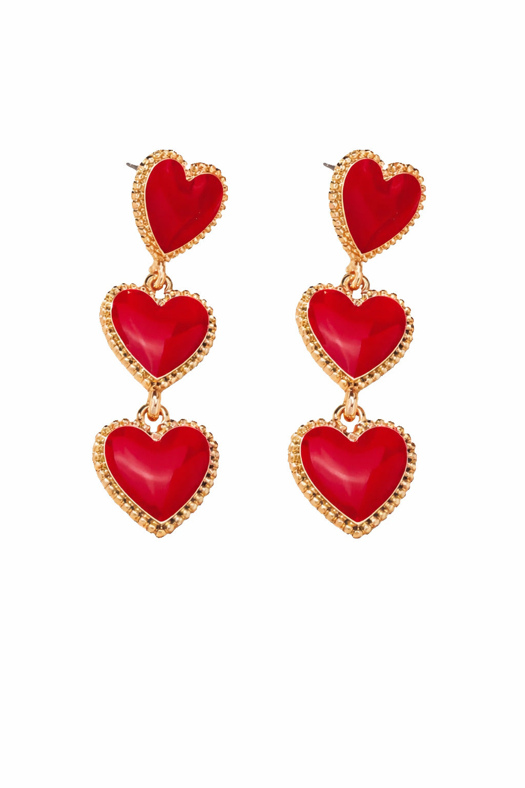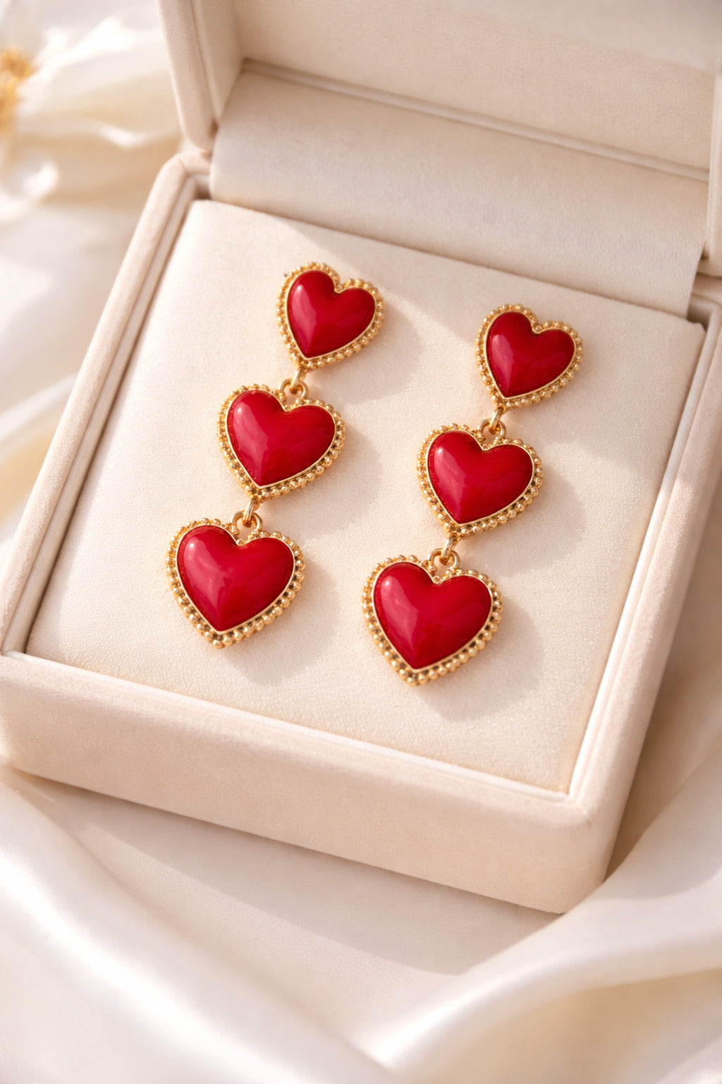 Fall in love at first sparkle. Our Triple Heart Drop Earrings feature three glossy red hearts framed in delicate gold beading, creating a romantic statement that moves beautifully with every turn of your head. Designed to stand out while still feeling elegant, these earrings are the perfect blend of bold love and timeless charm.