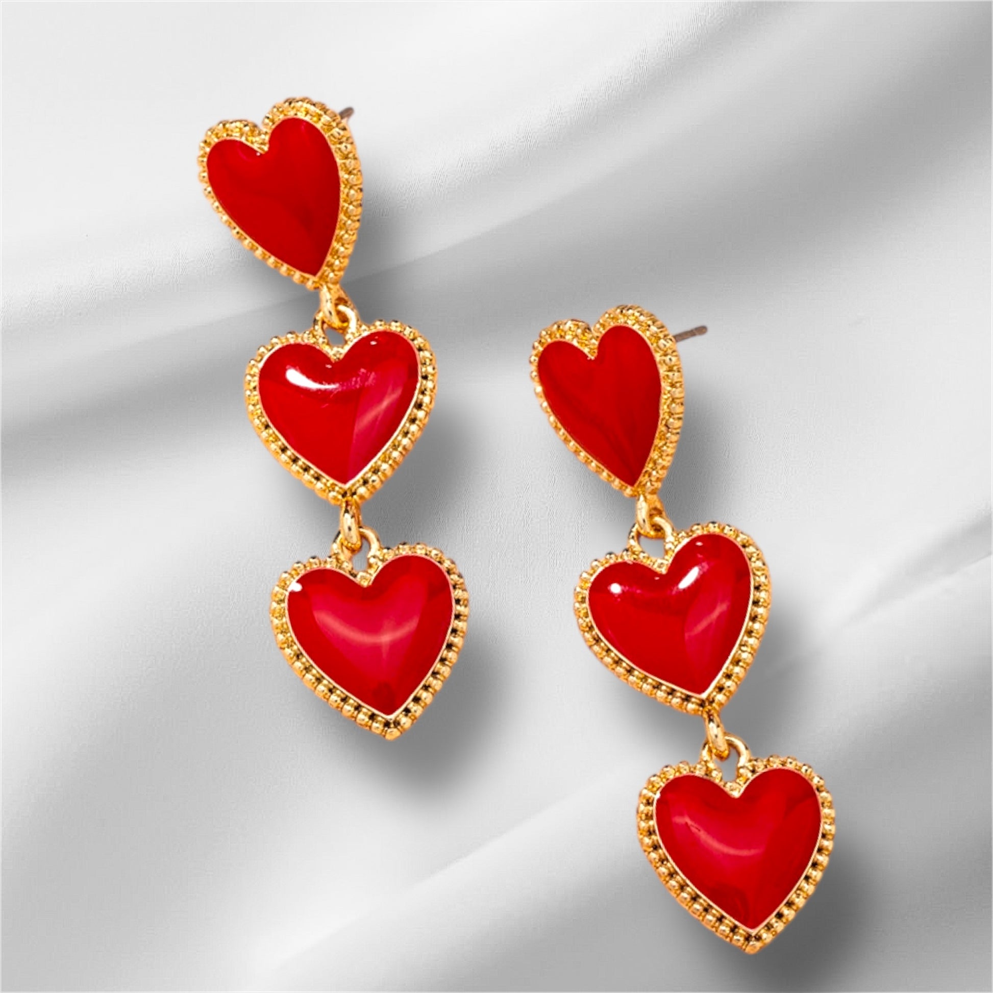 A mesmerizing pair of red and gold heart-shaped triple dangle earrings that will leave you spellbound!