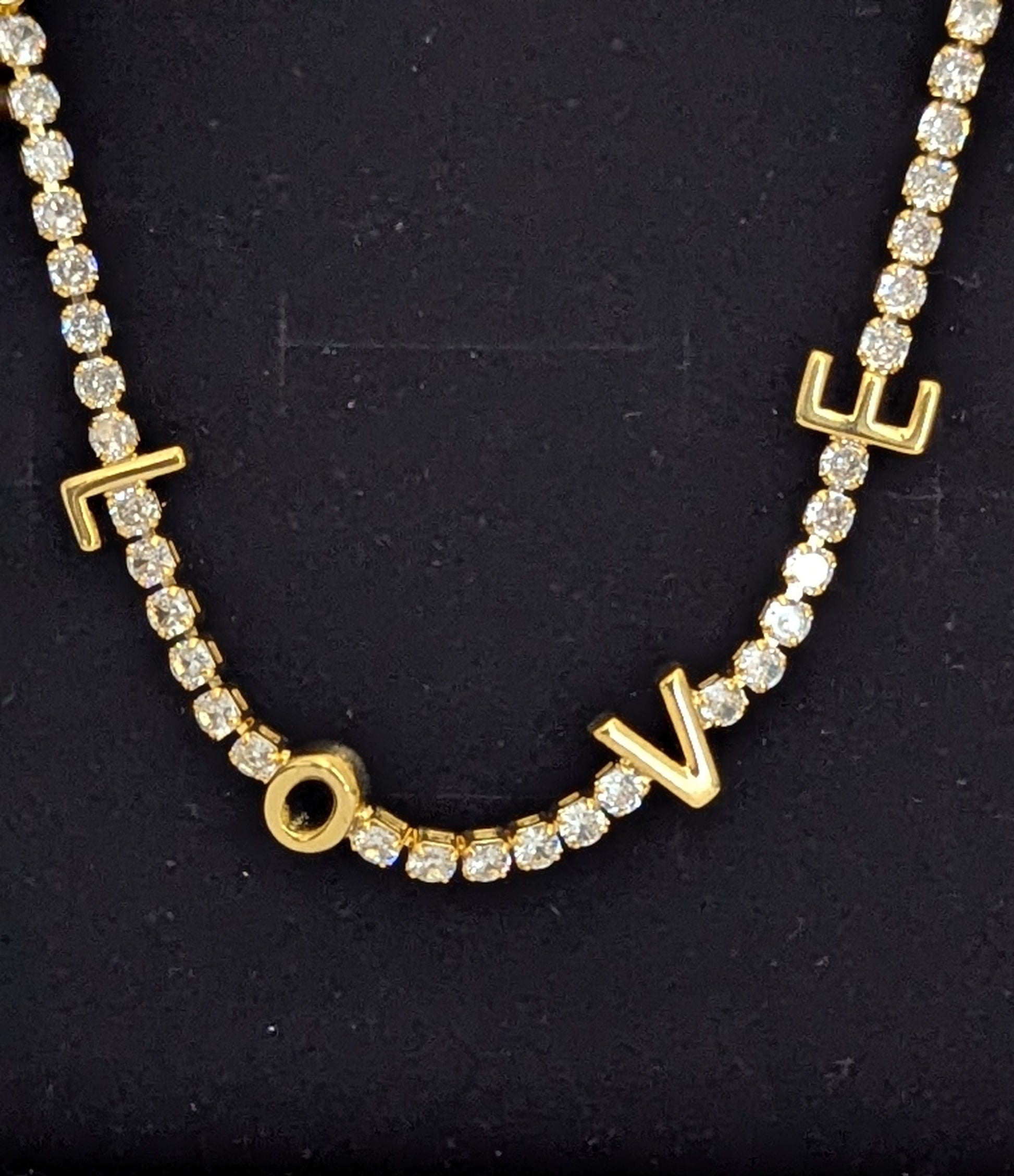 This enchanting piece elegantly showcases the letters L-O-V-E, exuding a timeless charm that is sure to captivate hearts. Each sparkling rhinestone is carefully set to shimmer and dance with every movement. special. Embrace the power of love with our "Eternal Love" gold rhinestone choker necklace.