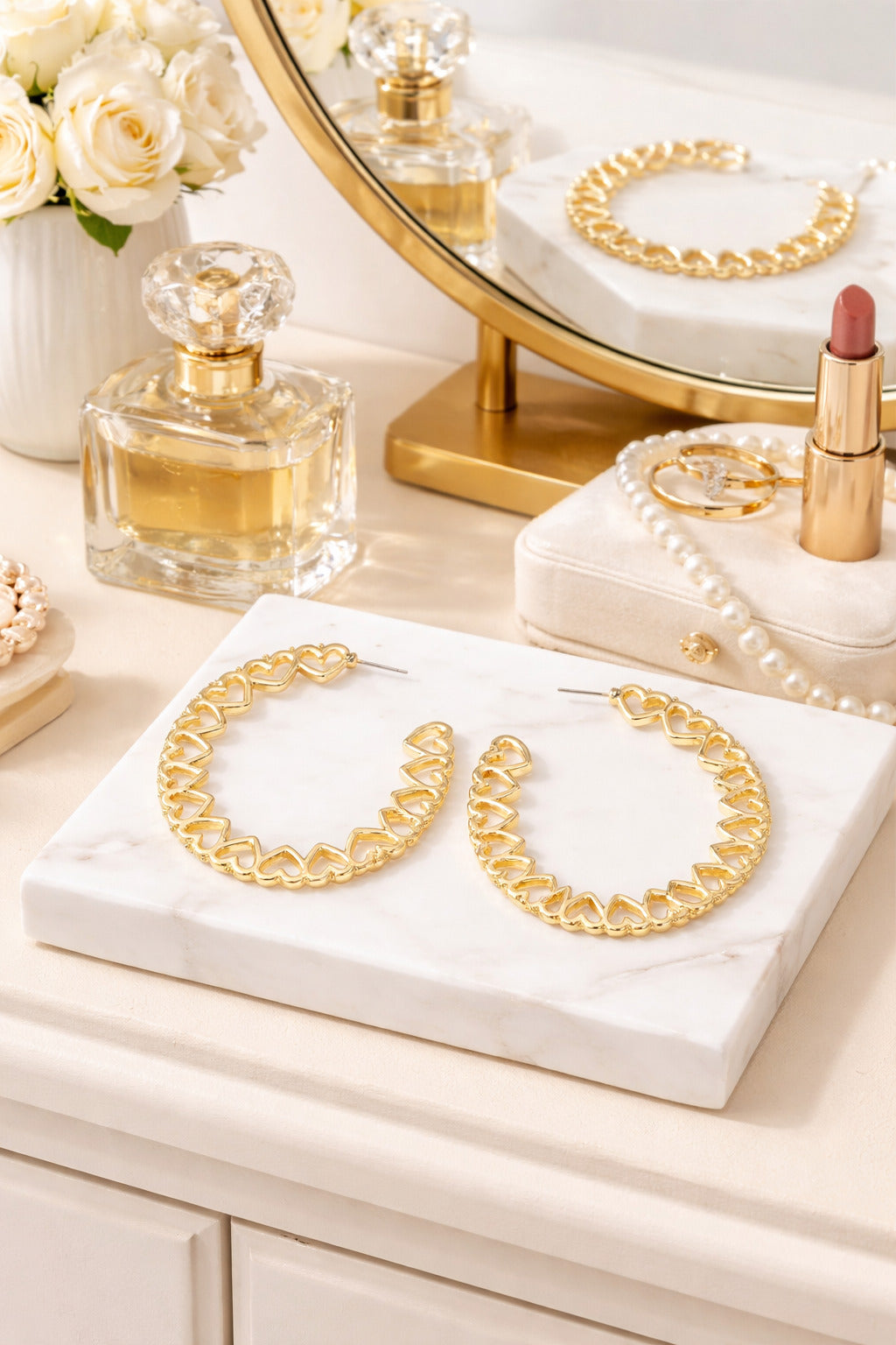 These elegant and unique earrings feature a captivating C-shape design adorned with delicate hearts that encircle the entire earring. Embrace the symbol of love and grace, designed to add a touch of sophistication to any outfit.