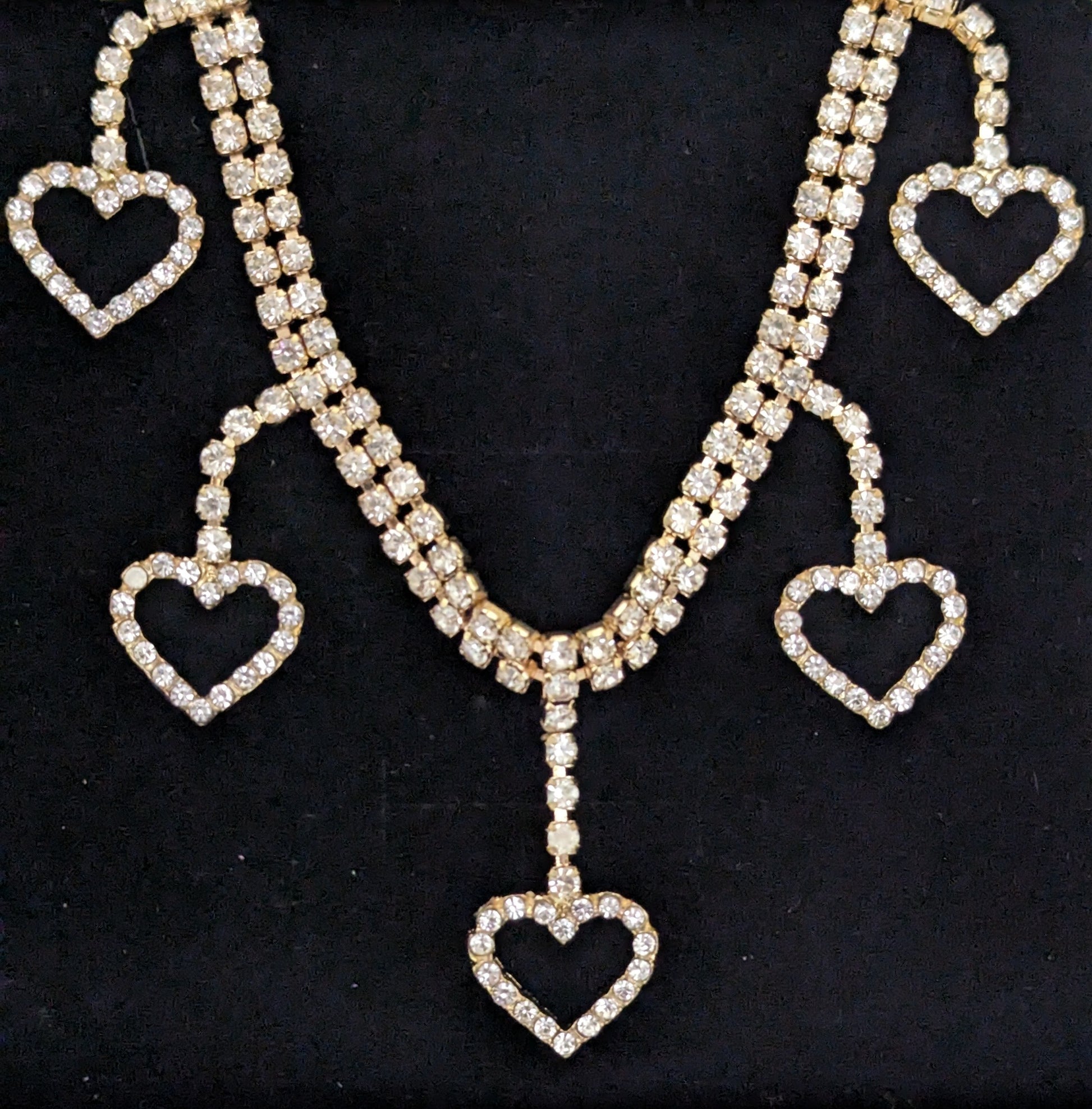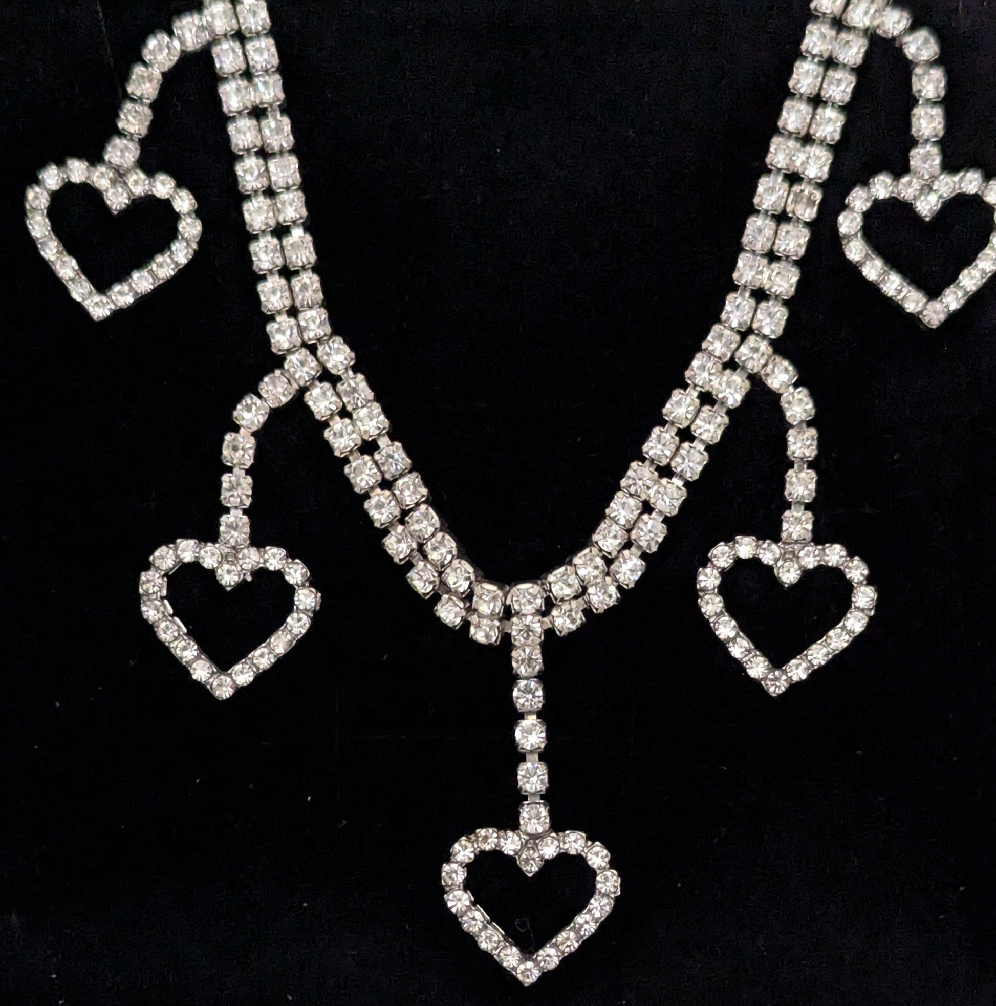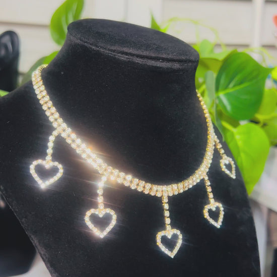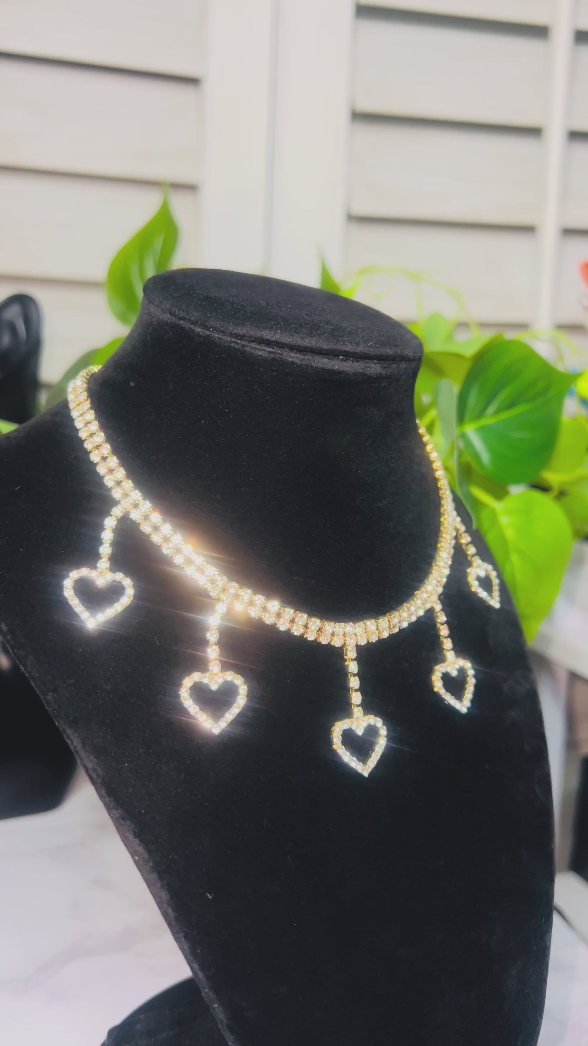 A captivating rhinestone choker necklace with exquisite rhinestone heart dangles. Embrace your inner sparkle and let your heart shine with this stunning accessory that effortlessly adds glamour and romance to any outfit.